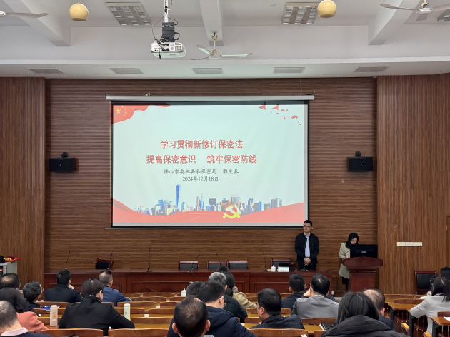 为深入学习贯彻习近平总书记关于保密工作的重要讲话和重要指示批示精神,增强领导干部保密责任意识、筑牢保密思想防线,12月18日,佛山市机要和保密局督查科科长郭庆养应邀到开云作题为《学习贯彻新修订保密法提高保密意识筑牢保密防线》的保密知识专题培训。学校党委副书记钟真宜,全体中层干部及涉密人员参加了学习。