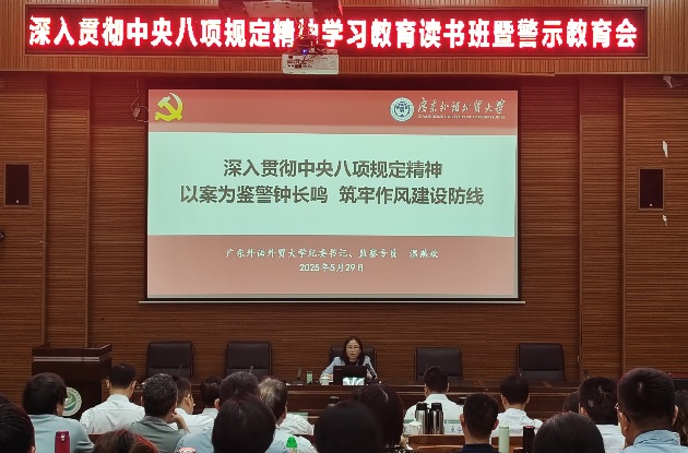 为深入学习领会习近平总书记关于加强党的作风建设的重要论述,强化以案示警,教育引导党员干部深入贯彻中央八项规定精神,以作风建设新成效推动学校高质量发展,5月29日上午,学校召开深入贯彻中央八项规定精神学习教育读书班暨警示教育会,邀请广东外语外贸大学党委常委、纪委书记、省监委驻广东外语外贸大学监察专员,二级高级监察官温燕欢作警示教育专题辅导报告,并组织观看警示教育片。党委书记陈铭贵主持会议。全体校领导,副科级以上干部和相关部门关键岗位干部参加会议。