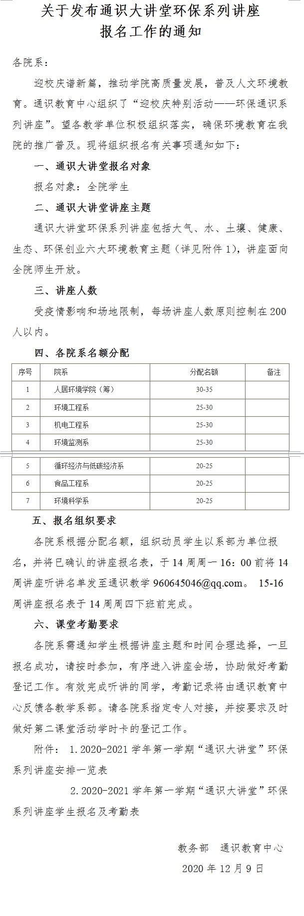 迎校庆专题活动——关于做好通识大讲堂环保系列讲座报名工作的通知