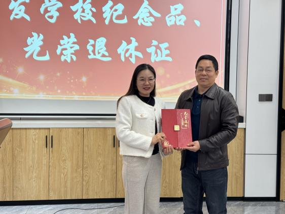 叶惠琴代表学校为赵新教授颁发荣休证书和“桃李满园”纪念品,对赵新教授为学校付出的辛勤劳动表示衷心的感谢,并为其即将步入新的人生轨道送上深深的祝福。希望赵新教授能够退而不休,继续关心支持学校和学院的发展。