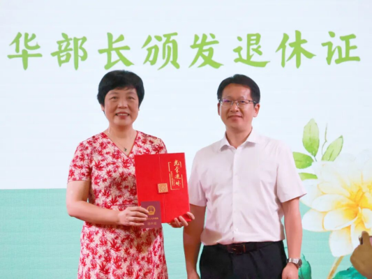 副校长、工会主席宋学忍为蔡部长颁发光荣退休证书,鲜红的证书闪耀着无悔奉献的光辉。