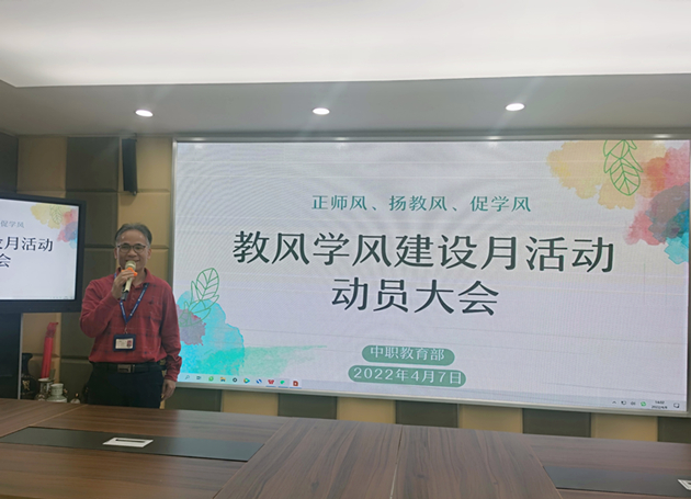 为切实落实学校立德树人的根本任务,增强中职教育部全体教职工教书育人的责任感和使命感,激发学生学习的主动性和积极性,4月7日下午,我部召开以“正师风、扬教风、促学风”为主题的教风学风建设月活动动员会议,全体教职工参加,分管教学工作的林帼秀副部长主持会议。