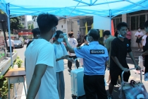 图 工作人员对新生进行体温检测、健康码查验和行李消杀