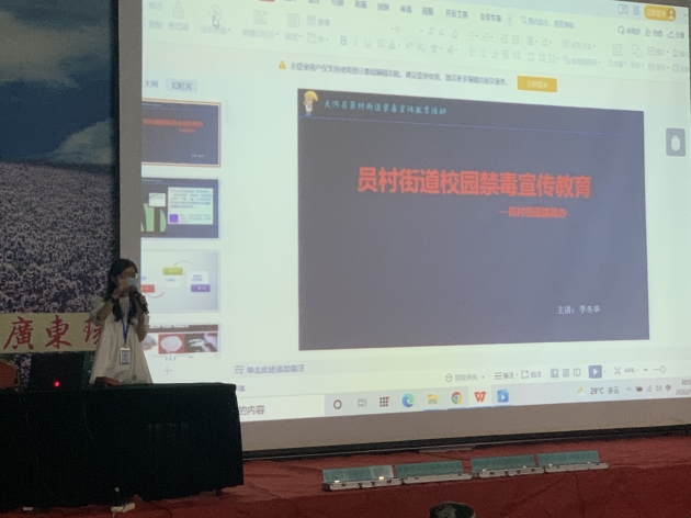 本次讲座邀请到员村街预防毒品宣讲团成员李冬华作为主讲人,通过图片、视频展示和现场问答互动等形式,以丰富、详实的图文资料和真实案例,介绍了毒品对个人身心和社会造成的危害。她指出如今毒品类型多样化、交易类型多样化、吸毒人员低龄化等特点,强调了现在禁毒的严峻形势,并告诫同学们要学习禁毒知识,远离毒品,自觉抵制毒品,树立自我保护意识。