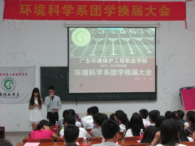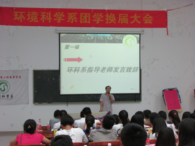 2014年6月18日晚,环境科学系的换届大会在教学楼117举行。秧志强、方丹彤、黄华、官贵、贾明等老师,以及环境科学系学生会、团总支全体成员和各系团学代表等学生干部近90多人参加了本次换届大会。