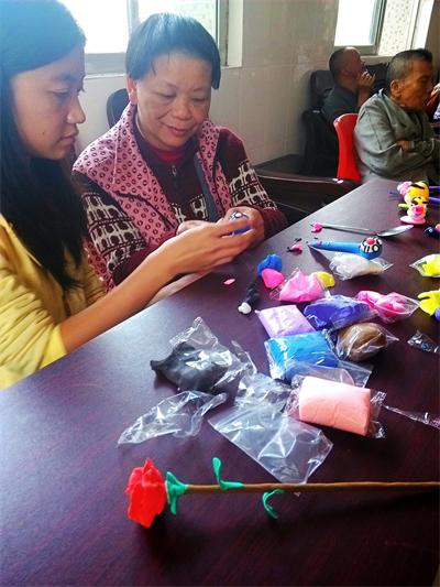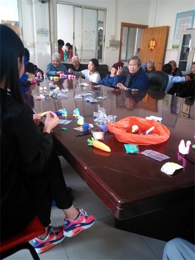 中午12:30,绿益环保协会成员先与丹灶社区敬老院的社工做了简单交流后,就马不停蹄地开始布置活动现场并完成其他前期准备工作。14:30活动正式开始,协会成员把老人们请进了展厅,“一对一”地教老人们制作黏土制品。全程协会成员主动与老人们交流、聊天,力求为每位老人送爱心、送温暖、送开心。老人们非常感动,也将自己的人生故事分享给了协会成员。老人们脸上露出的灿烂笑容是协会成员最大的安慰。