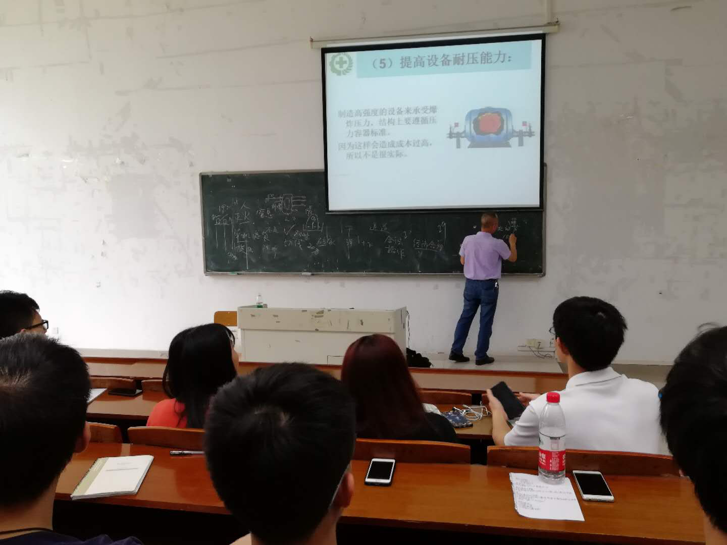 讲座上,陈叔华总工引用几个典型的粉尘爆炸案例,深入浅出地剖析粉尘爆炸事故发生的原因,并结合多年从业经验总结出在实际生产过程中如何防范粉尘爆炸。交流环节中,陈叔华总工热情地回答了同学们有关专业学习、职业规划的问题,表示欢迎同学们去企业现场参观学习。