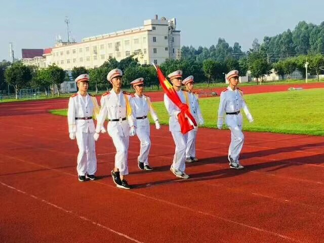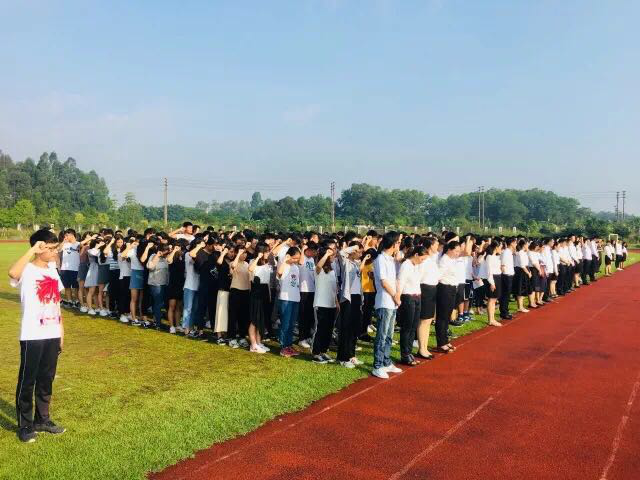 伴随着激昂雄壮的国歌声,鲜艳的五星红旗冉冉升起,迎风飘扬,全系师生齐唱国歌,行注目礼。
