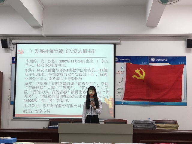 随后,按照发展党员的组织程序,何依妮等18名发展对象逐一宣读入党志愿。入党介绍人分别介绍了18名同志的基本情况,支部书记郭璐璐同志报告了党支部对18位同志的审查情况。与会党员进行了充分讨论,经过无记名投票表决,一致同意接受何依妮等18名发展对象为中共预备党员。