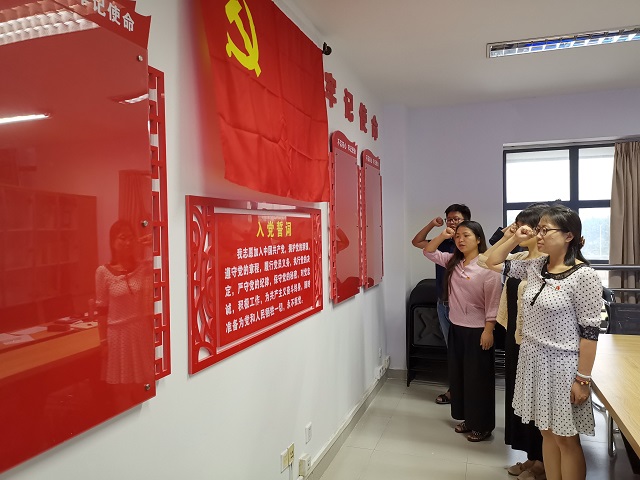 会议首先由支部副书记方丹彤同志带领支部委员学习《中国共产党党员教育管理工作条例》,她强调每个党员,不论职务高低,都必须按照党章要求和《条例》规定,接受党组织的教育管理。随后支部书记郭璐璐同志带领大家一起重温入党誓词,借此提醒各位同志“不忘初心、牢记使命”,增强组织生活的仪式感。