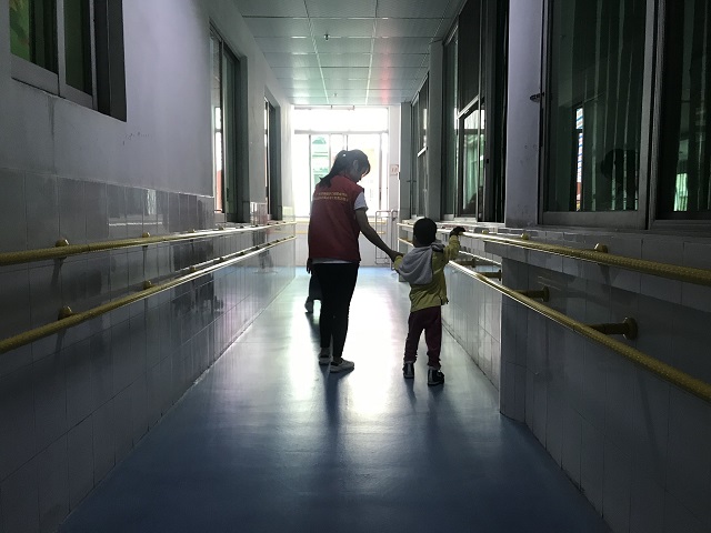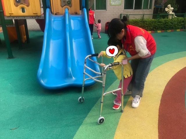 福利院中的孩童患有唐氏综合征,不能自己行走,常年只能透过窗户看阳光。队员的到来让孩童倍感欣喜。每一位孩童都由一名队员一对一贴心照顾,大手牵着小手在阳光下自由行走,感受阳光的温暖和滑滑梯的乐趣。阳光轻抚在孩童的脸上也温暖了队员的心。队员陈翠霞说:“当我们牵起他们的小手走出幼儿室的时候,他们特殊的面庞无法挂着微笑,可是脚步却加快了许多,从眼神中透露着欢欣。”
