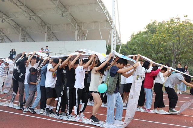 本次新生心理素质拓展活动主要包括足球游戏、袋鼠跳、折返跑摆四子棋和无敌风火轮四个环节。足球游戏环节旨在活跃活动气氛,打破班级僵局,消除同学之间的陌生感,为后续环节的顺利开展打下基础;接下来通过袋鼠跳、折返跑摆四子棋环节锻炼班级同学的合作意识,让同学们明白合作重要性;最后的无敌风火轮环节更是将活动气氛推向制高点,同学们齐心协力在用报纸制成的“风火轮中”迈着整齐一致的步伐,不断滚动前行向终点冲刺,在合作过程中体会集体的力量。
