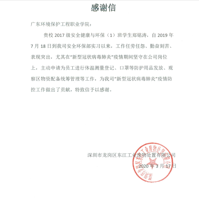 近日,我系收到一封来自深圳市龙岗区东江工业废物处置有限公司的感谢信,信中表扬了2017级实习生郑铭涛在实习单位的突出表现。原文如下: