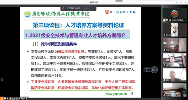 6月24日下午,我系线上召开了安全技术与管理人才培养方案论证研讨会。会议邀请了广东科旭检测评价技术服务有限公司教授级高级工程师潘广峰、广东轻工职业技术学院高级工程师严国南、广东省安全生产协会国家注册安全工程师李杞容、广汽集团乘用车有限公司工程师郑纯希、广东金泰达安全科技有限公司高级工程师邓金华五位专家组成专家组。会议由系副主任余秋良主持,安全教研室全体教师参加会议。安全技术与管理专业负责人徐超志老师介绍了我系安全专业的人才培养目标、就业方向及前景、配套实训条件等基本情况。