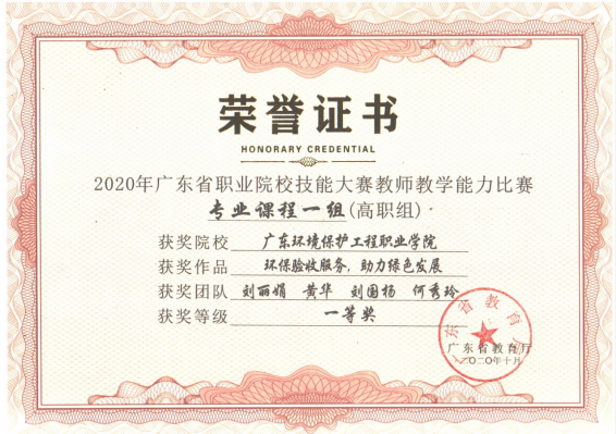 本专业拥有一支“双师结构-服务型”教师队伍,是佛山市南海区教师教学创新团队,专任授课老师93%以上获硕士学位,高级职称(副教授、高级工程师)7人,省级高职教育专业领军人才1人,省级优秀青年教师1人。教师团队中注册环境影响评价师6人、注册环保工程师1人,多位老师入选省生态环境厅、佛山市、清远市等环境保护专家库专家。同时聘请了生态环境部华南环境科学研究所、广东智环创新环境科技有限公司等多名行业内专家学者任客座教授、兼职教师指导日常教学实践活动。团队教学成果丰富,获2020年广东省教学能力比赛一等奖,在微课、教学设计等教学比赛中多次获奖。