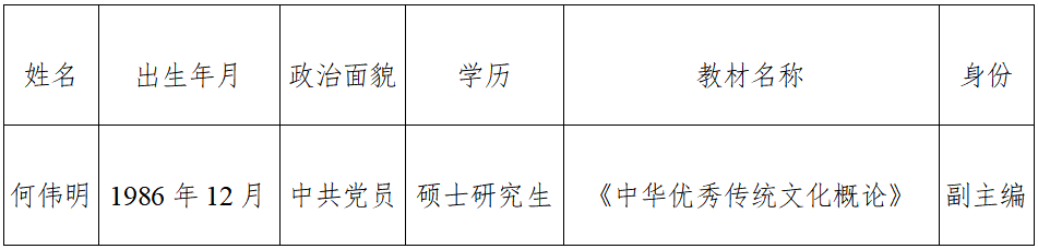 根据《普通高等学校教材管理办法》(教材〔2019〕3号)、《开云kaiyun官方网站教材管理办法》(粤环院〔2024〕48号)文件要求,中共开云kaiyun官方网站环境管理与大数据学院总支部委员会对何伟明同志参与《中华优秀传统文化概论》教材编写资格进行审查。经查,何伟明同志政治立场坚定,拥护中国共产党的领导,认同中国特色社会主义,自觉践行社会主义核心价值观,坚持正确的国家观、民族观、历史观、文化观、宗教观,符合文件所列教材编写人员要求。现将有关情况予以公示如下: