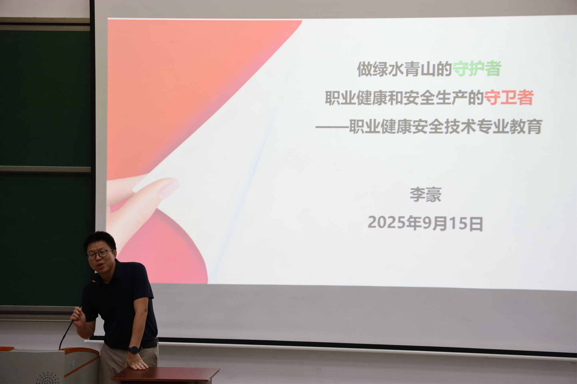 同日,职业健康技术专业负责人李豪老师为该专业新生开展专业认知教育,全面介绍专业定位、课程体系、实训条件、实习就业、毕业资格及升学途径等情况,并结合生动案例与详实数据,阐述了该专业在守护绿水青山、保障职业健康与安全生产中的重要作用。李老师鼓励新生们勇于挑战、积极创新,立志成长为行业的中坚力量。
