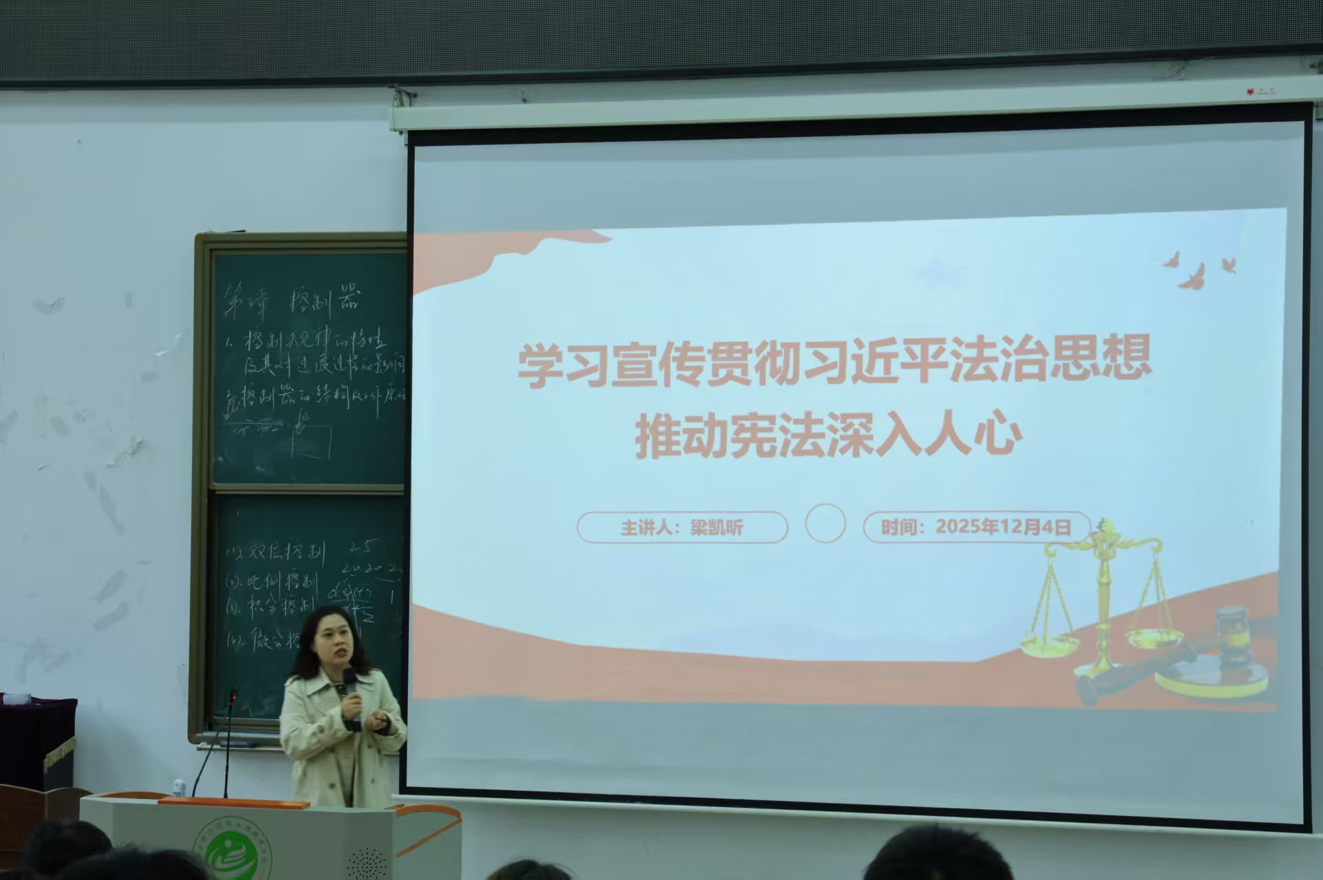 为迎接12月4日国家宪法日,弘扬宪法精神,增强学生法治意识,环境管理与大数据学院于当日下午在教学楼120教室开展“学宪法 讲宪法”主题教育活动。活动特邀学校马克思主义学院梁凯昕老师作专题讲座,学院各年级学生代表参加学习。