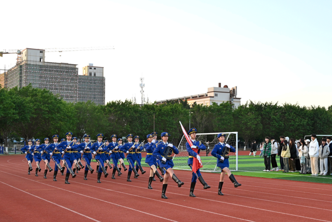 伴随着主持人的宣布,护旗手迈着铿锵步伐护送国旗至升旗台。《义勇军进行曲》奏响,五星红旗冉冉升起,全体师生肃立行注目礼,爱国情怀与责任担当在心中激荡。