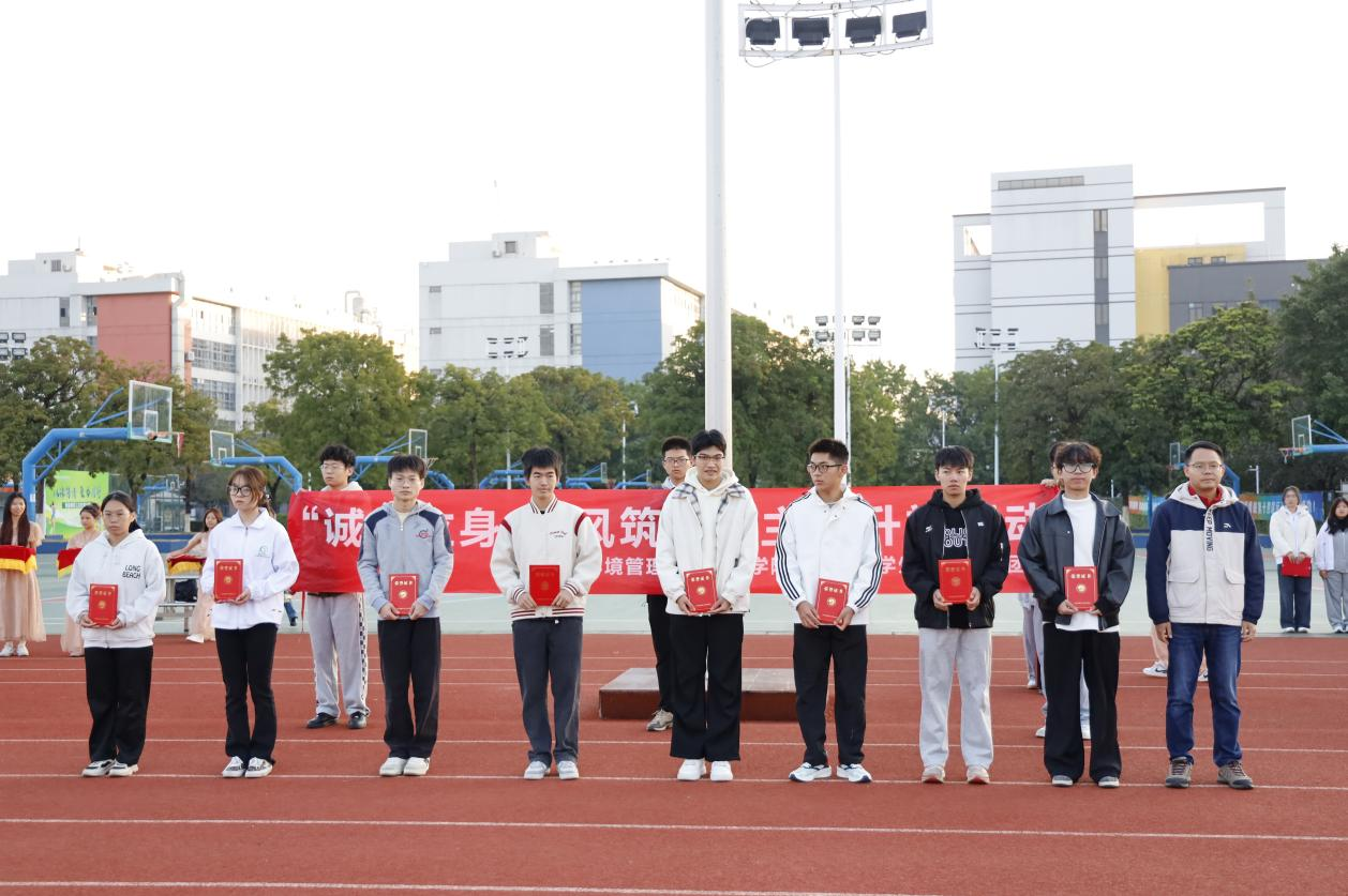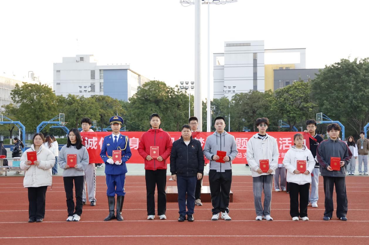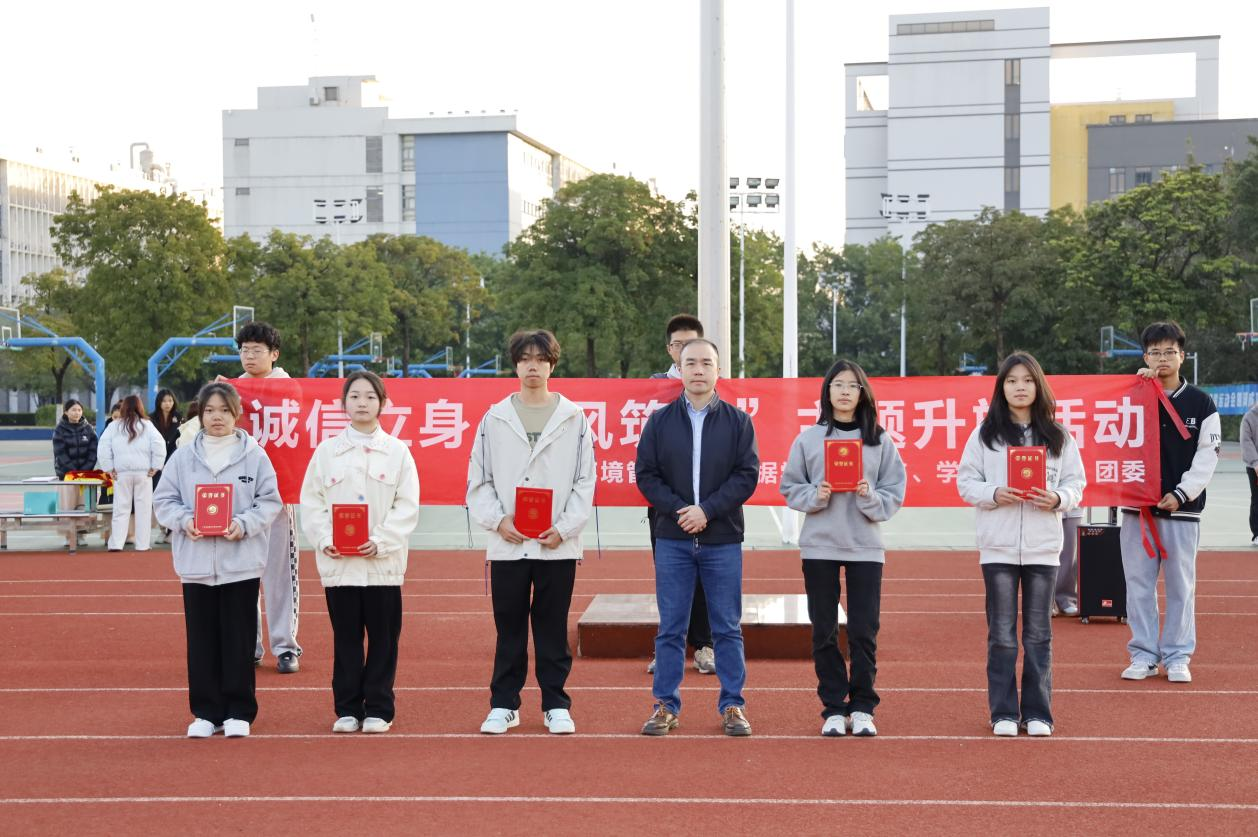 随后,学生代表陈嘉颖分享了科学复习方法,呼吁大家坚守诚信底线。在领誓人带领下,全体学生进行诚信应考宣誓,铿锵誓言彰显文明应考决心。活动还对学风建设优秀班集体和 “学习之星” 进行表彰,颁发证书树立榜样。最后,全体师生与受表彰对象合影留念。
