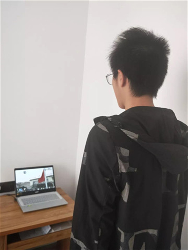 国旗冉冉升起,同学们隔着屏幕行注目礼。