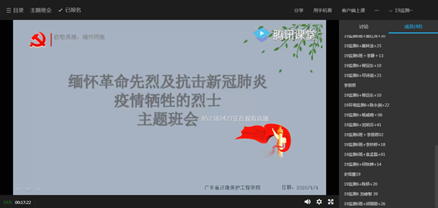 本学期第五周,环境监测系于腾讯会议,举行了严肃的“缅怀革命先烈及抗击新冠肺炎疫情牺牲烈士”主题班会。