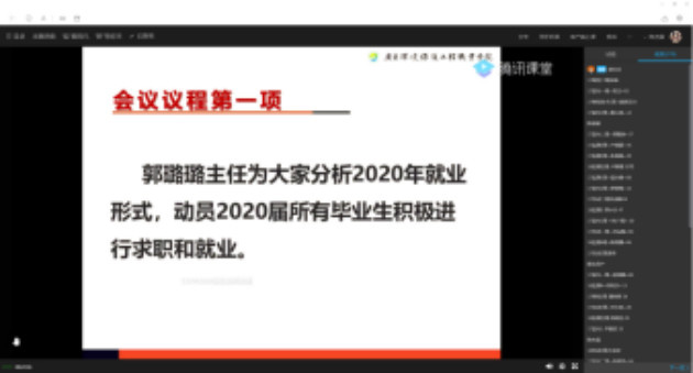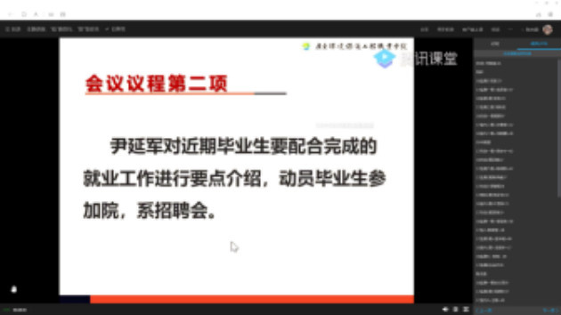 为推动我系2020届毕业生积极就业,5月14日,我系通过腾讯课堂召开2020届毕业生就业动员大会。郭璐璐主任、朱称水副主任、就业专职老师尹延军、陈杰霖、18级辅导员胡兵兵,及我系2020届全体毕业生参加了会议,大会由朱称水副主任主持。