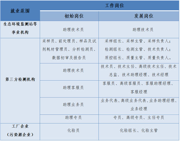 本专业毕业生就业岗位主要面向环境监测一线的采样人员、试剂耗材管理人员、前处理人员、分析检测人员、数据处理人员和数据报告人员,扩展岗位包括环保设施运营人员、环境影响评价人员和环保产品销售员。