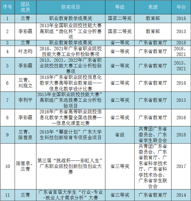 环境监测技术专业团队于2019年立项确定为广东省优秀教学团队,团队教师均具有硕士以上学历,拥有国务院政府特殊津贴专家、国家环境保护专业技术领军人才、国家环境监测尖端人才1人、广东省十三届人大常委会委员、环资委委员、民进广东省委资环工委主任1人,省级专业领军人才1人、省“千百十”人才1人、广东省大气环境首席专家和粤方技术负责人1人。团队专任教师共获国家科技进步二等奖1项,国家级教学奖项1项,编写国家级规划教材1部,省部级科技奖5项、省级教学奖项17项,主持国家级、省级、市厅级、校级教科研课题分别有4项、9项、14项和23项,累计50项;立项2门省级精品在线开放课程;共发表SCI论文18篇、中文核心20篇,编写著作15部,获得专利授权9项,主持国家标准起草1项,完成国家检测方法标准验证4项;团队指导的学生获得国家级职业院校技能大赛获奖1项、省级以上的职业院校技能大赛获奖21项,挑战杯获奖6项,创新创业比赛获奖3项。