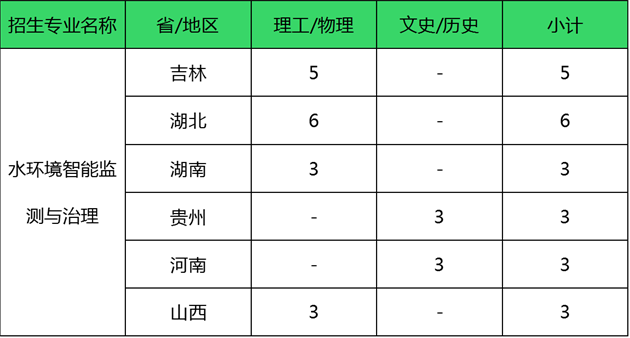 2022年水环境智能监测与治理专业计划招生177人(扩招),春季高考招生计划117人(其中,学考招生53人,“3+证书”招生64人);普通高考计划招生75人,(其中广东省内37人,省外23人)。