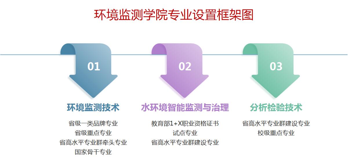 环境监测学院是学校首批成立的教学单位之一,有全国党建工作样板支部1个、是全省党建工作标杆院系创建单位,省“双带头人”教师支部工作室1个。现开设环境监测技术、水环境智能监测与治理、分析检验技术3个专业,具有国家骨干专业1个、省第一批高水平专业群1个、省重点专业、省一类品牌专业1个、省二类品牌专业1个,省精品在线开放课程2门,省课程思政示范课程1门。国家级产教融合实训基地1个、央财支持国家级实训基地,国家级公共实训中心,国家级协同创新中心1个,省示范产业学院1个、省级大学生校外实践基地4个。2010年至今累计培养高职检测类专业人才7000余人,学生在职业技能、“挑战杯”、“创新创业”等各类竞赛中获国家奖4项,省级以上奖项60余项,毕业生受到行业、用人单位青睐。