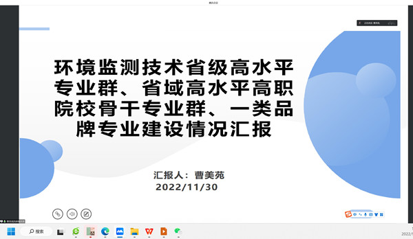 会上,环境监测技术专业群牵头专业负责人曹美苑汇报了项目建设阶段性进展情况、目前面临的问题,并提出相应的对策,总体上讲,2022年,专业群及品牌专业在人才培养模式创新、三教改革、实践基地建设、技术技能平台、社会服务、国际交流与合作等方面都取得了一定进展。近期已组建了专业群建设项目团队,分解任务,集中力量攻克标志性成果,会议对教师教学团队建设开展了研讨。同时筹备环境监测技术一类品牌专业建设项目的验收工作,落实省域高水平高职院校骨干专业群、省级高水平专业群工作的月报、季报机制,推进各项任务的有序开展。