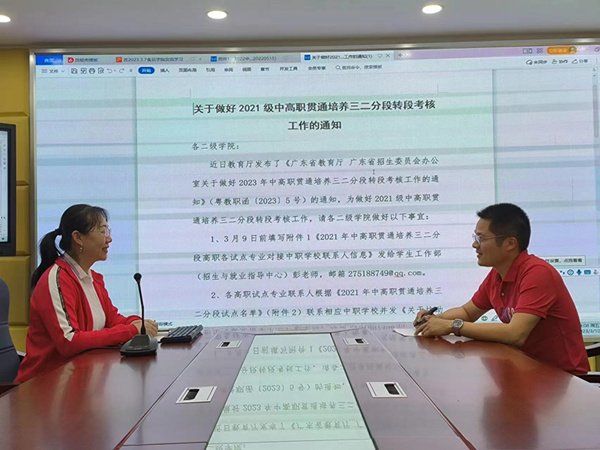 为贯彻落实《广东省教育厅 广东省招生委员会办公室关于做好2023年中高职贯通培养三二分段转段考核工作的通知》(粤教职函〔2023〕5号)的要求,进一步做好我院试点专业(环境监测技术)与中职教育部的对接工作,3月10日下午,环境监测技术专业教师张恒走访了中职教育部,并进行了相关调研工作。