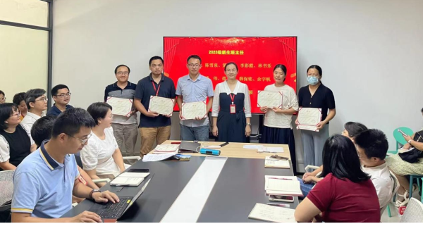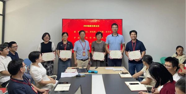 优秀班主任刘庭立、伍娟和辅导员胡兵兵分别分享班主任、辅导员工作经验。朱称水、戴险峰为2023级班主任颁发聘书。