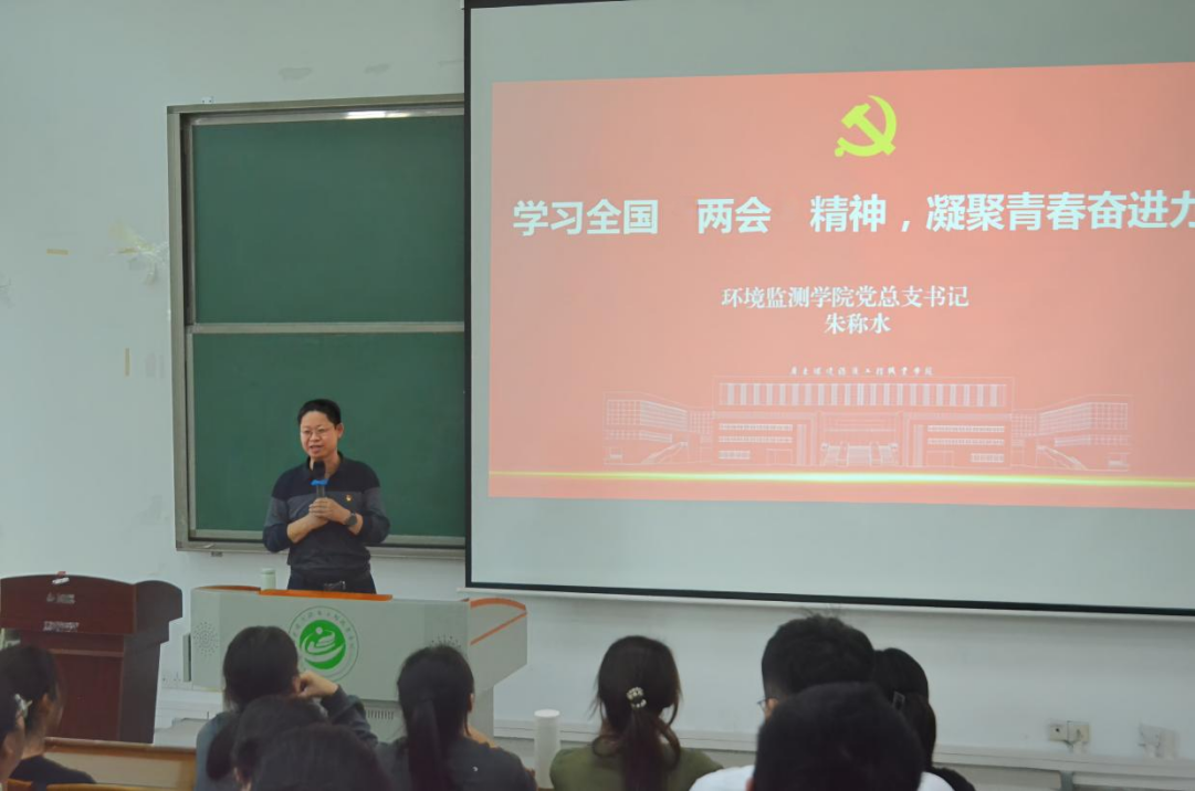 3月26日,环境监测学院党总支书记朱称水以《学习全国两会精神,凝聚青春奋进力量》为题,讲授2024年春季学期“开学第一课”。我院入党积极分子、23环境监测技术1班和23水环境智能监测与治理1班的同学们认真聆听课程。