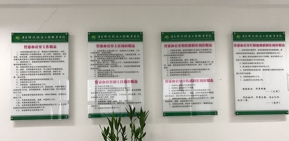 上墙岗位职责共有4块,分别是党委办公室工作职责,主任、副主任岗位职责,组织科科长职责、宣传科科长职责、纪检监察科科长职责。同时,在办公室还设置了“忠诚、担当、务实、清廉”八个大字,以及习近平总书记语录:“凡是有利于党和人民事业的,就坚决干、加油干、一刻不停歇地干;凡是不利于党和人民事业的,就坚决改、彻底改、一刻不耽误地改,”真正起到时时处处警醒的作用,按照“两学一做”的要求,努力成为一名四讲四有的党务工作者,推进学院党建工作再上新台阶、新水平。