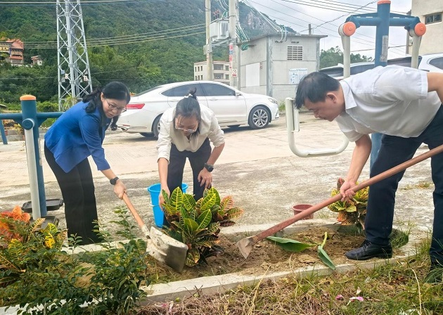 调研期间,钟真宜还与当地干部群众共同栽种七彩变叶木,示范庭院绿化与生态景观融合的具体做法,生动展现了学校在绿美广东生态建设中的实践指导作用。