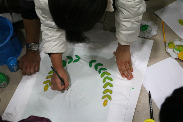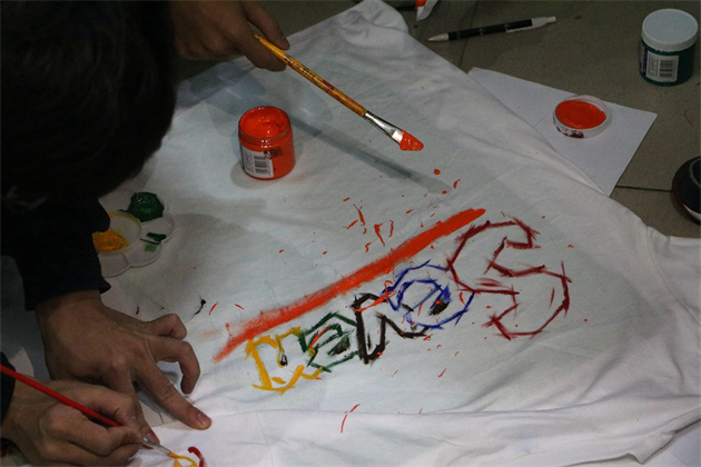 学员的创作热情高涨,不畏地板冰冷,席地而坐。在这里没有师兄或师妹、没有学生主席学生书记,有的只是一群天马行空的“画家”,一群淘气的涂鸦少年。他们将自己的奇思妙想融入笔中,画在衣服上。服装的设计风格或俏皮可爱、或寓意深远、或康定斯基式抽象。