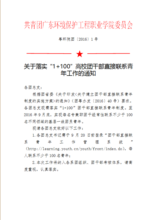 关于落实“1+100”高校团干部直接联系青年工作的通知