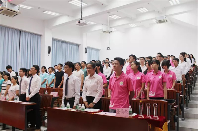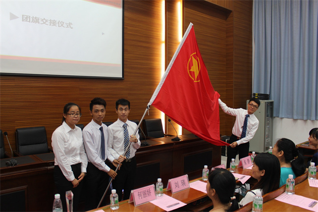 团委刘瑛副书记为新一届团委学生干部颁发聘书及工作铭牌,并激励大家积极做团委优秀传承者;以身作则,发挥模范表率作用;树立服务理念。新老书记团交接团旗仪式结束,由新任书记团代表陈晖发表就职演讲。