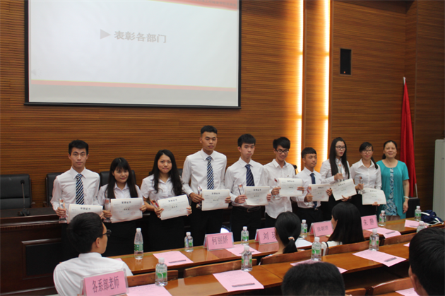 承载着团委的刘瑛副书记,指导老师朱静老师和上一届部长们温馨寄语的团委视频拉开换届大会的帷幕。全体起立奏唱团歌后,上一届的副书记阙利运向大会作过去一个学年的工作报告,并在报告中深刻而鲜明地展示了团委过去一年的工作成果。为表彰先进,激励斗志;张朝清副处长对优秀部门进行颁奖。书记团、秘书部及广播部同时获得奉献奖;思教部和组织部同时获得敬业奖;社会实践部、文娱部同时获得协作奖;宣传部获得创新奖;院主持队、院舞蹈队、院合唱团一同获得新人奖。奖项颁发完毕,另一位13级的副书记冯柏铭也发表在团委工作的感言,教导学弟学妹们不忘初心,方得始终。而后各部门的负责人上台表达对接班人的祝贺与期望。