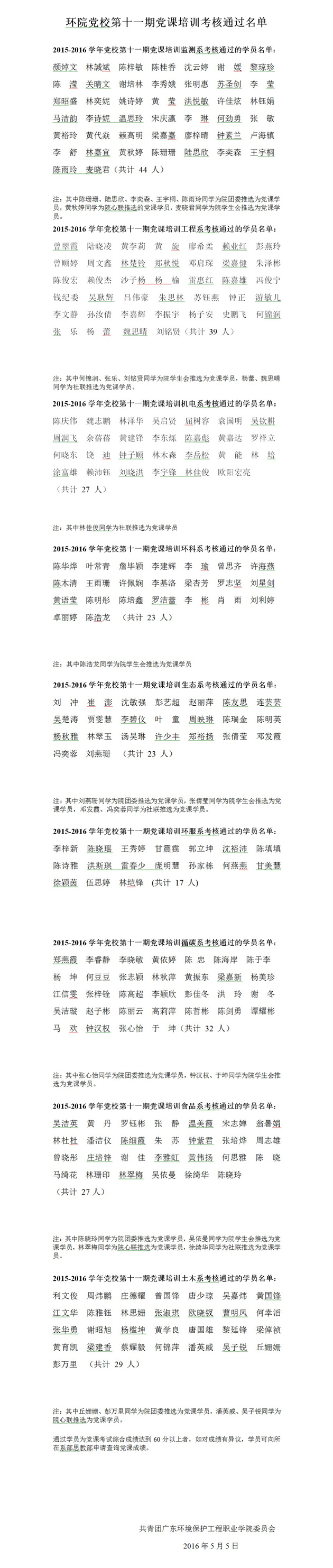 2015-2016学年党校第十一期党课培训考核通过学员名单公示