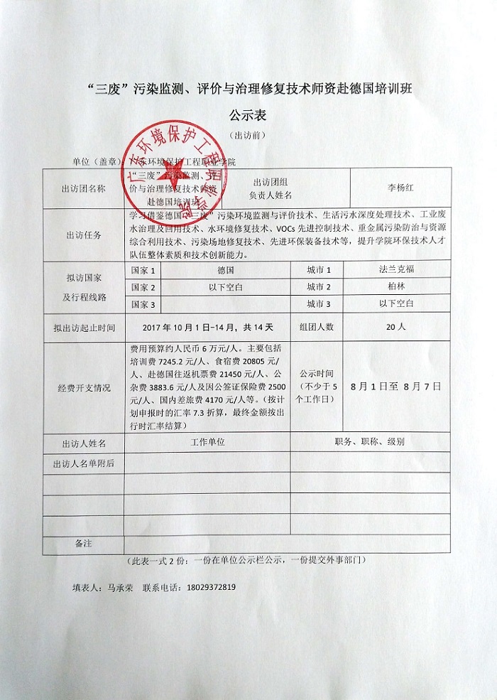 2017年“三废”污染监测、评价与治理修复技术师资赴德国培训班公示