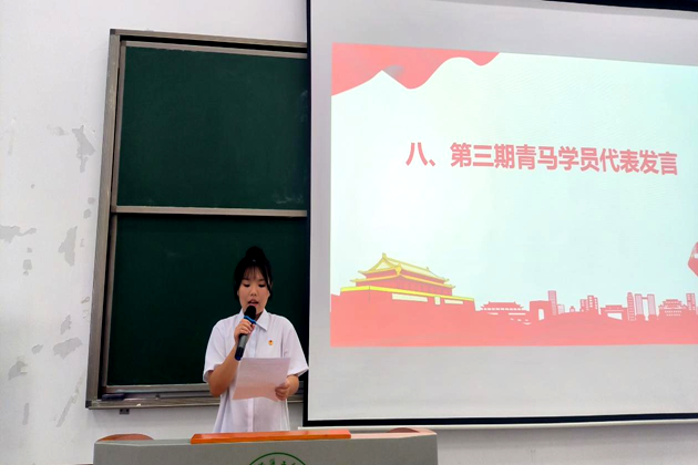 随后,郑泽玲同学代表新一期青马学员上台发言,她表达了对“青马工程”的热切期盼,并代表全体学员承诺将珍惜学习机会,不断提高自身思想政治素质和实践能力,以实际行动践行青春誓言,为实现中华民族伟大复兴的中国梦贡献青春力量。