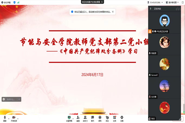 2024年6月17日,节能与安全学院党总支教师党支部第一党小组和第二党小组通过在线会议形式召开集中学习会议。本次会议组织全体党员对《中国共产党纪律处分条例》进行了全面学习,由每位党员逐字逐句原原本本地对《中国共产党纪律处分条例》进行学习。各教师党员针对自己实际工作情况,互相交流了学习心得。