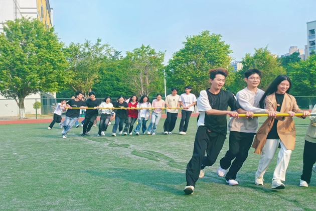 活动现场,同学们被随机分成多个小组,参加了“旋风跑”、“同心鼓”、“二人三足”等一系列富有创意和挑战性的素拓游戏。现场气氛热烈非凡,欢声笑语不断。