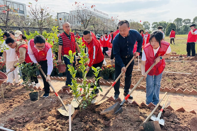 3月12日,在全国第47个植树节之际,节能与安全学院教师党支部以“植绿护绿美广东,劳动育人践初心”为主题开展主题党日活动。副校长冯定坚、教师党支部书记杨帆带领全体教师党员,在学校东北角劳动教育基地共同栽种桂花、艾草、佛手、柠檬等植物,以实际行动践行习近平生态文明思想,厚植“绿美广东”生态底色,弘扬新时代劳动精神。