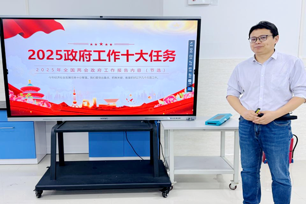 首先,学院党总支纪检委员蔡东方老师对2025政府工作的十大任务进行详细领学,他从任务内容、目标及重要意义,引导教师们深入理解政府工作重点方向。
