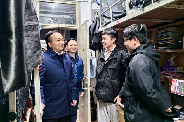随后,冯定坚走访学生宿舍,实地查看学生居住环境,了解同学们的日常生活状况。他仔细询问大家在学习、生活方面是否存在困难,实习求职的准备情况如何,倾听同学们对学校在教学、管理和服务等方面的意见建议。同学们敞开心扉,踊跃发言,就专业学习、宿舍环境、和食堂就餐等问题提出自己的看法。“没想到校领导会晚上来宿舍看望我们,感觉十分亲切!”同学们表示,“这样的走访让我们感受到学校的重视,心里特别踏实。”