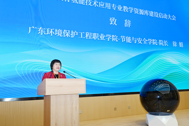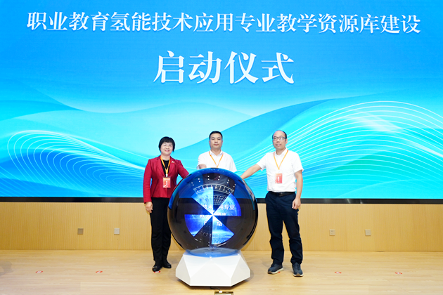 在参会领导和嘉宾的共同见证下,举行了职业教育氢能技术应用专业教学资源库建设启动仪式,徐娟院长作为牵头院校代表受邀上台共同开启启动仪式,随着启动球的点亮,标志着资源库建设正式启动。